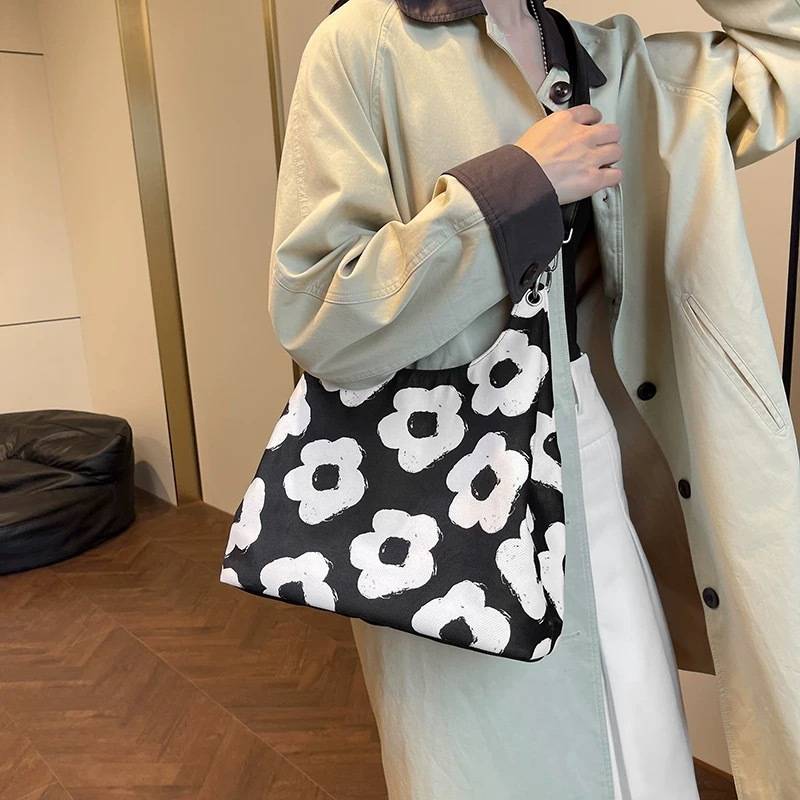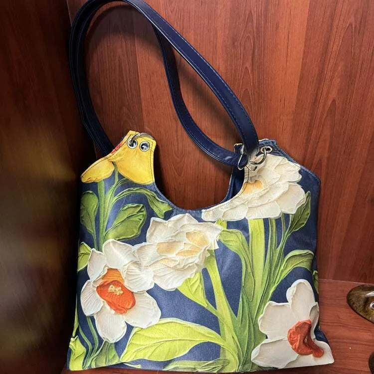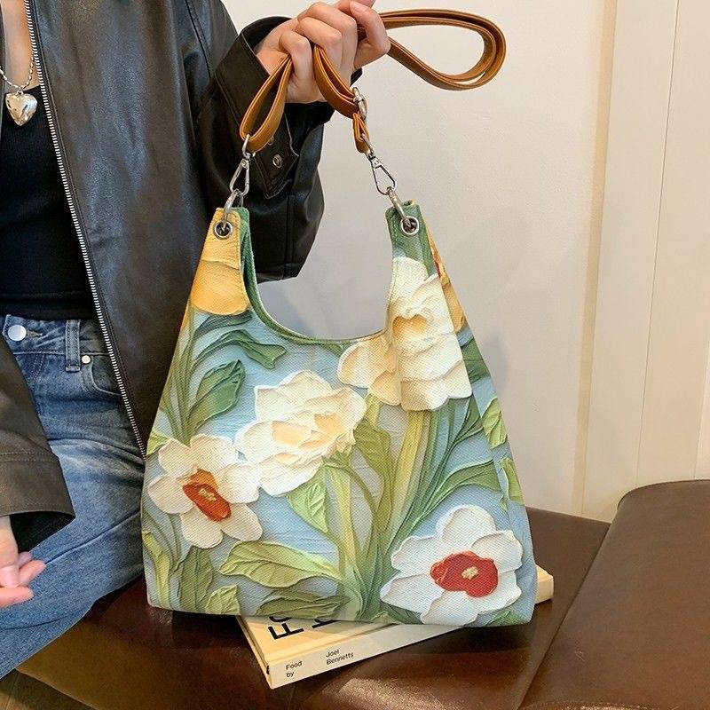 Bloom Art Skulderveske er ikke bare en taske – det er et stykke bærbar kunst. Det unikke 3D oliemaleri-design med frodige pæoner, narcisser og grønne blade ser næsten ud som om blomsterne springer ud af overfladen. Hver gang du bærer den, bærer du et kunstværk.
