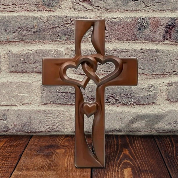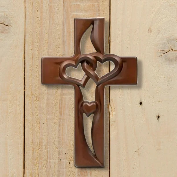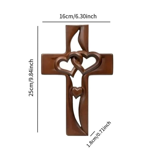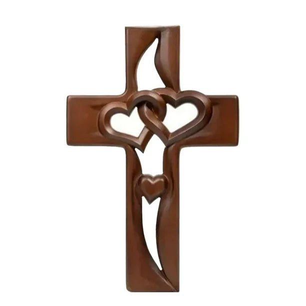 Et smukt håndskåret trækors med sammenflettede hjerter – et meningsfuldt symbol på evig kærlighed og guddommelig nåde til din væg.
