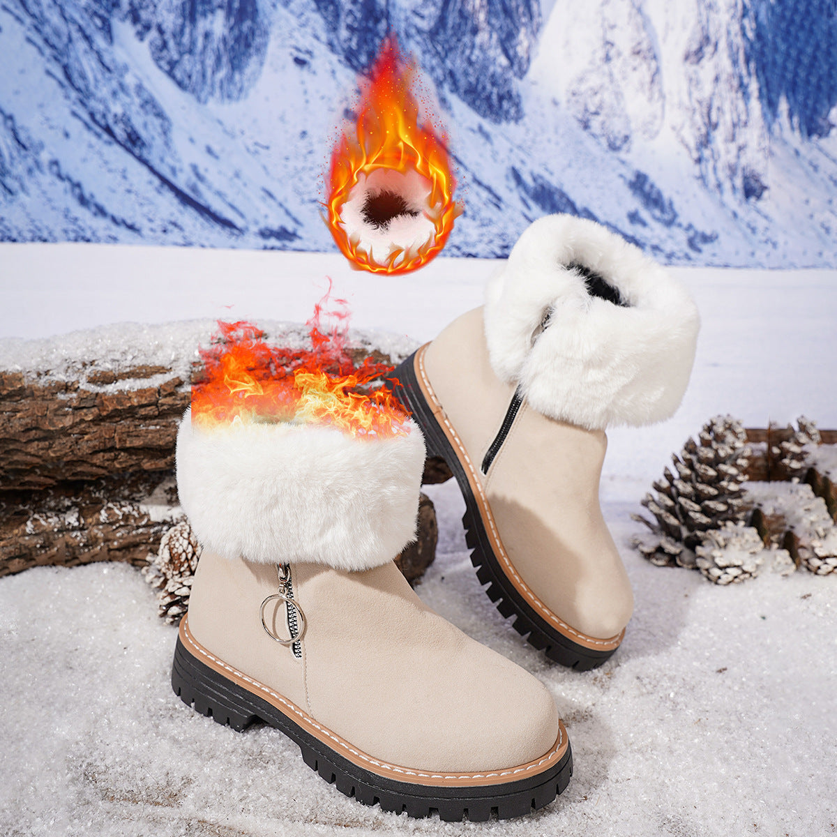 Fuld vandtæt fæstning – Dette er ikke blot en sprøj-på behandling. Disse støvler er konstrueret med premium gummisål og vandtæt foer, som betyder at ingen mængde slud, regn, eller sne nogensinde når dine fødder. Du går gennem alt uden at blive våd. Faux-fur fleece-foering der er luksus – Tyk, blød fleece hele interiøret udsender en varm omfavnelse omkring dine fødder – så blød at du næsten ikke behøver strømper. Det forhindrer også smertefulde blærer og numhedskuldener. Rock-solid non-slip sål – Speciel gummiblandung med riflet mønster der griber selv glat is og vådt asfalt. Du går helt stabilt gennem vinteren uden at være nervøs. Side-lynlås for sekunders hastighedspay – Ingen snøring, ingen frysen hænder. Glid din fod ind, lynlås op, og gå. Bred tå-boks + platform-stil – Dine tæer har plads til at spredes naturligt, mens du får en moderne, elegant silhuet der passer til alt fra bukser til kjoler.