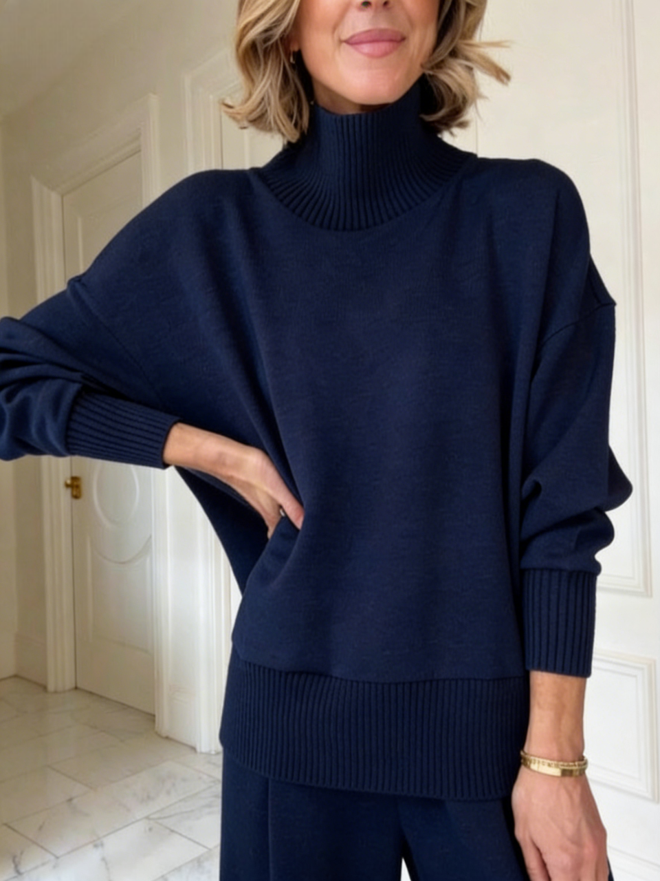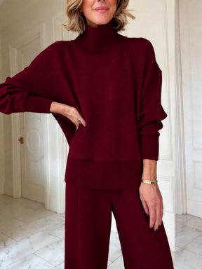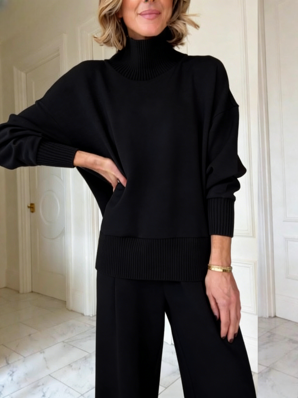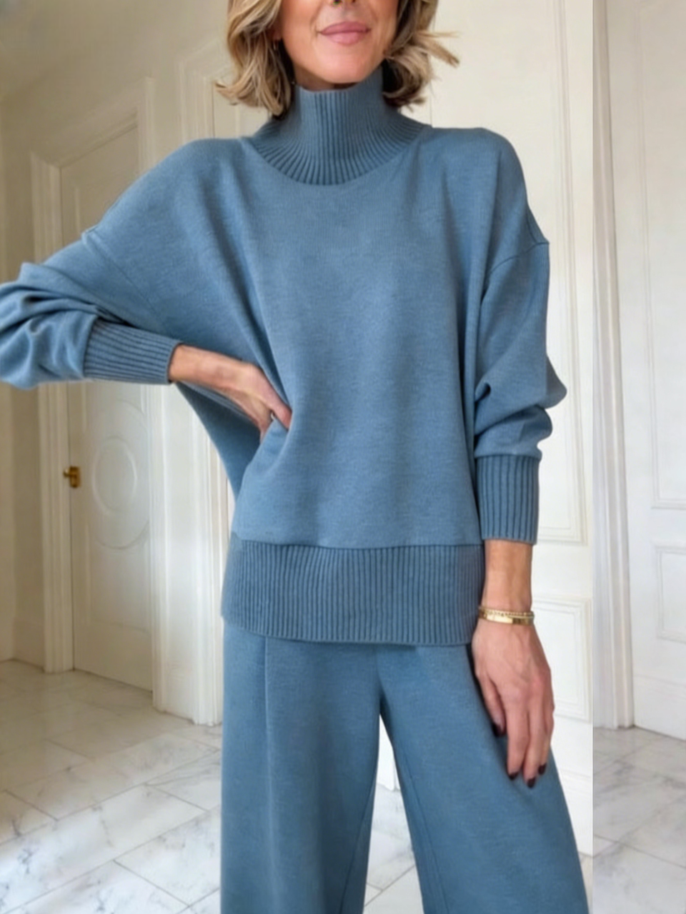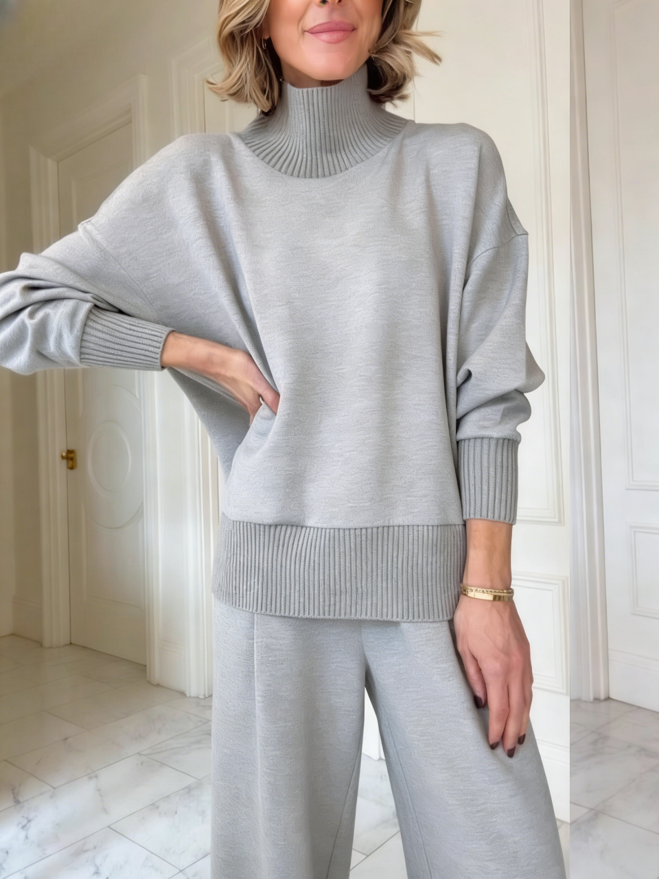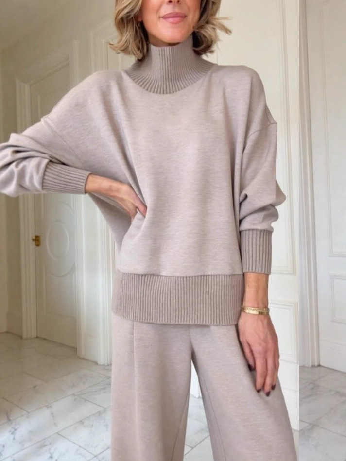 Slut med at vælge mellem hygge og elegance. Vores 2-delte sæt med ribstrikket høj hals leverer et sofistikeret, men afslappet look, der føles lige så godt, som det ser ud.