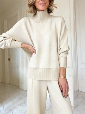Bevægelsesfrihed & Stil: Dyb ribstrikket høj hals og sideslidser i trøjen sikrer ubesværet elegance og optimal bevægelsesfrihed.