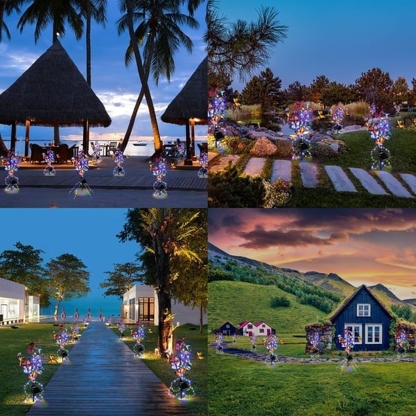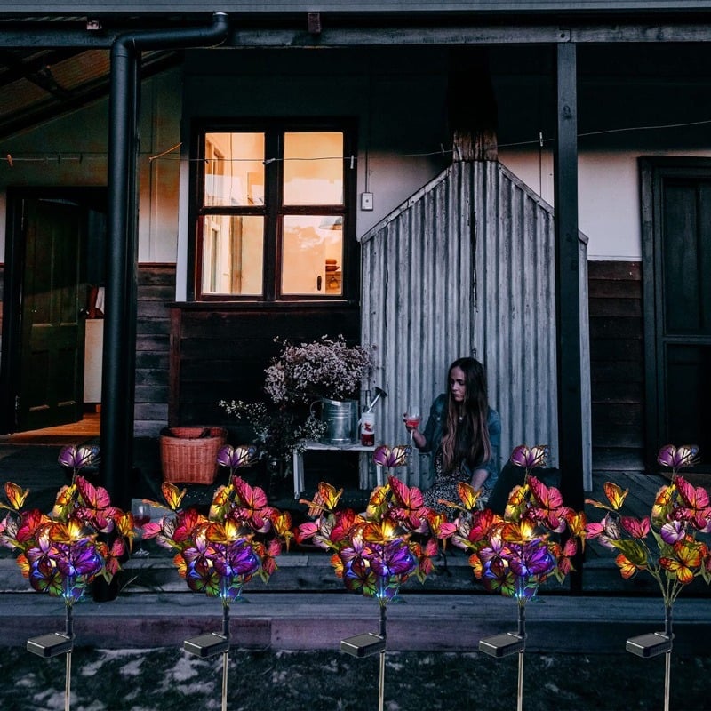 Forestil dig: en flok dansende sommerfugle i strålende farver – lilla, pink, orange og gul – der hviler på grenene og lyser op i det bløde aftenmørke. Det er præcis hvad disse solcelledrevne havelys skaber i din have, på terrassen eller balkonen.