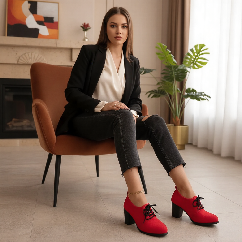 Rosa Elegance Snøresko kombinerer tidløs vintage-stil med den komfort, dine fødder fortjener. Det bløde ruskindslignende materiale i en modig rød farve fanger øjnene, mens de sorte snørebånd og blokhæl tilføjer klassisk elegance.